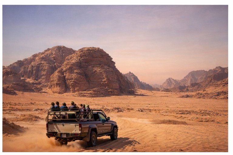 On Day Two, embark on a thrilling 2-hour 4x4 jeep tour in Wadi Rum. Discover ancient rock inscriptions, natural rock bridges, vast desert valleys, and filming locations linked to Lawrence of Arabia. This guided desert safari is one of the top adventure experiences in Jordan.